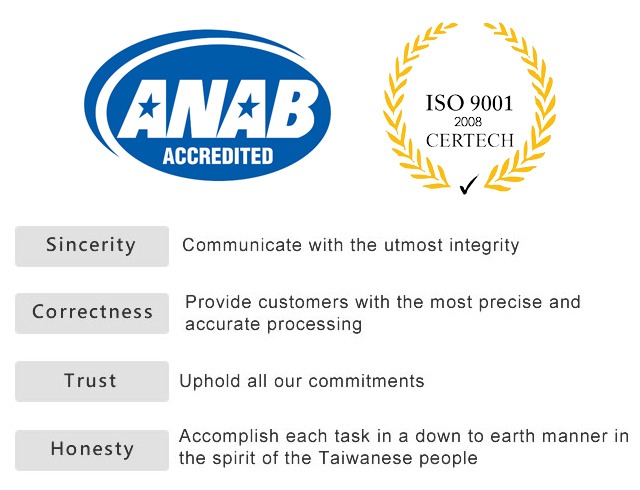 We cooperate with each customer to meet the cost demands and create the maximum benefit for our customers by upholding the traditional Taiwanese virtues of integrity and trust. We also use maximum daily output to meet the customers' anticipated delivery date. We are committed to accomplish every mission.